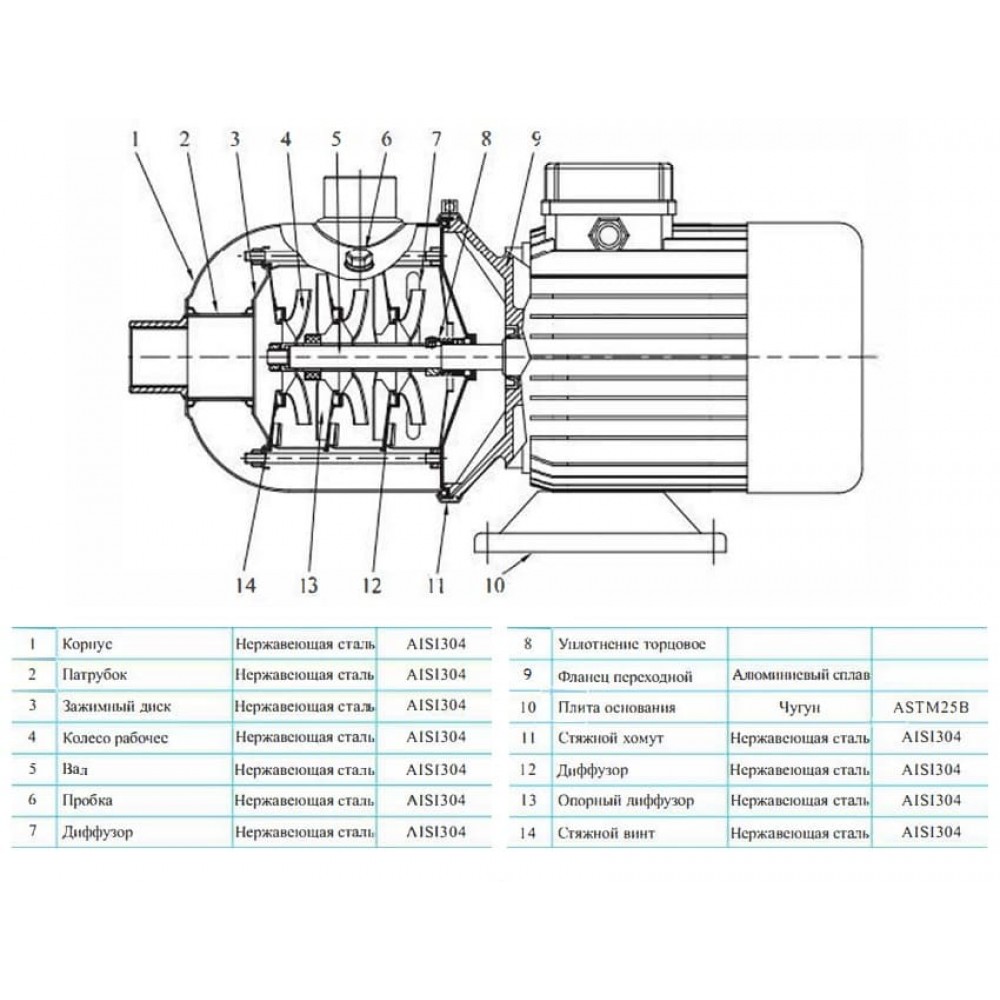• Рабочие колеса и диффузоры: нержавеющая сталь AISI 304. Рабочие колеса изготовлены методами штамповки и сварки из листовой нержавеющей стали и установлены на удлиненном валу электродвигателя консольно.
