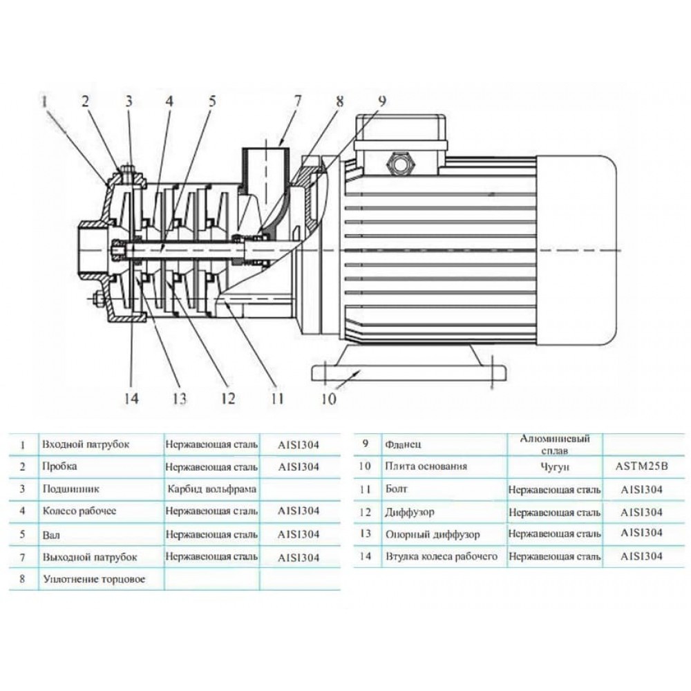• Всасывающий и напорный патрубки: нержавеющая сталь AISI 304